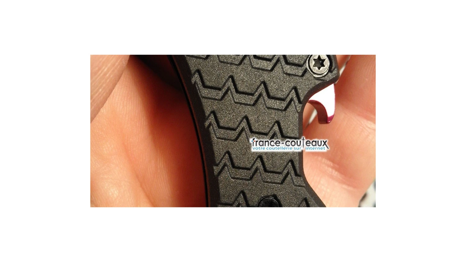 On ne peut pas passer Ă cĂŽtĂ© de son esthĂ©tique flashy et agressive: une lame fushia Ă lâonglet ajourĂ©, la forme de sa lame au dos cassĂ©, les encoches pour le pouce sur son dos de lame, son tranchant en pointe sont les ingrĂ©dients de ce cocktail sĂ©duisant.