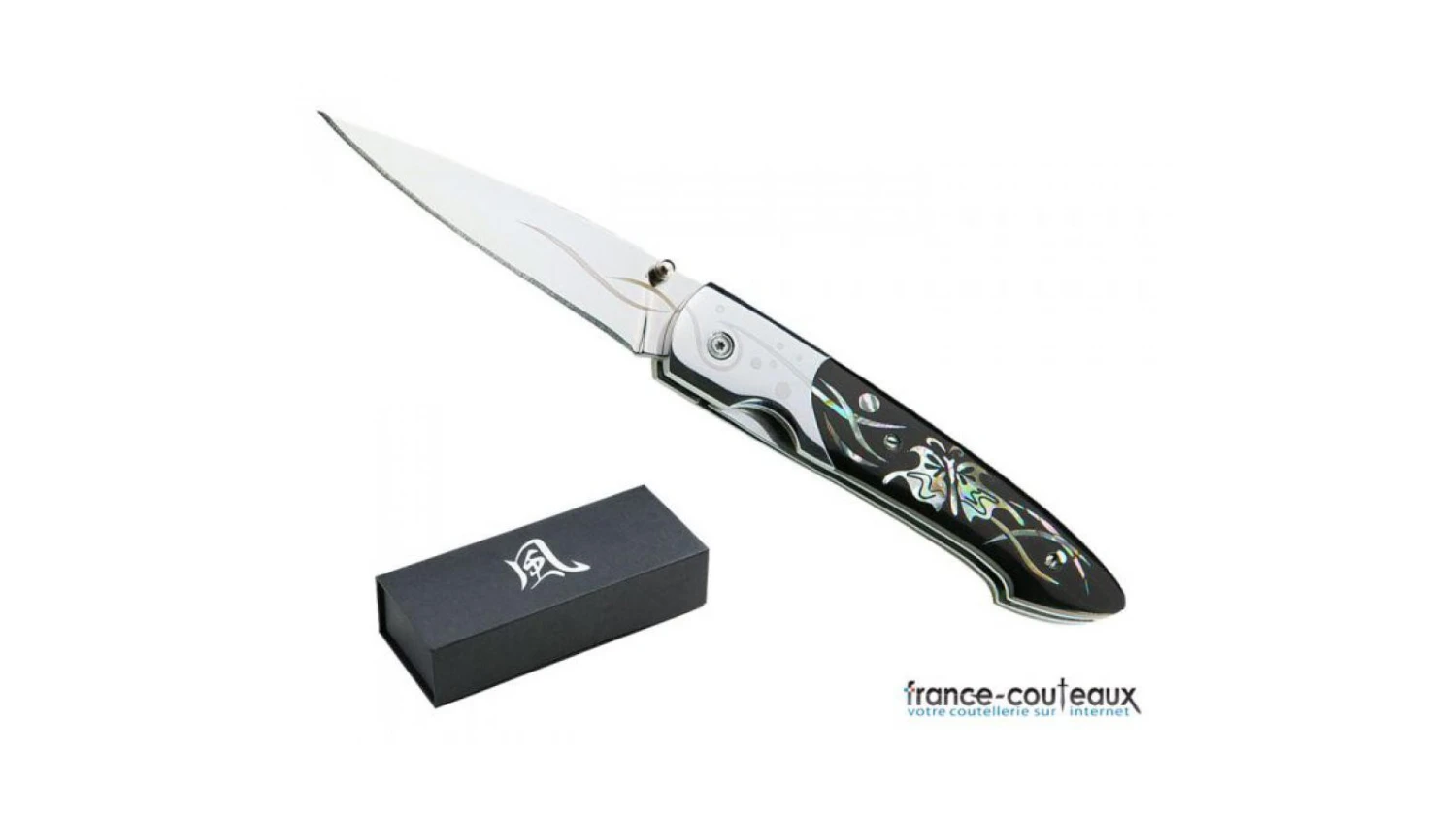 Couteau féminin et élégant, ce modèle de chez Herbertz dispose d’un manche an micarta noir profond incrusté d’abalone, avec un papillon entouré de motifs chinois. Très beau couteau en design et aux finitions soignées avec un clip de port à la ceinture et un dos guilloché.