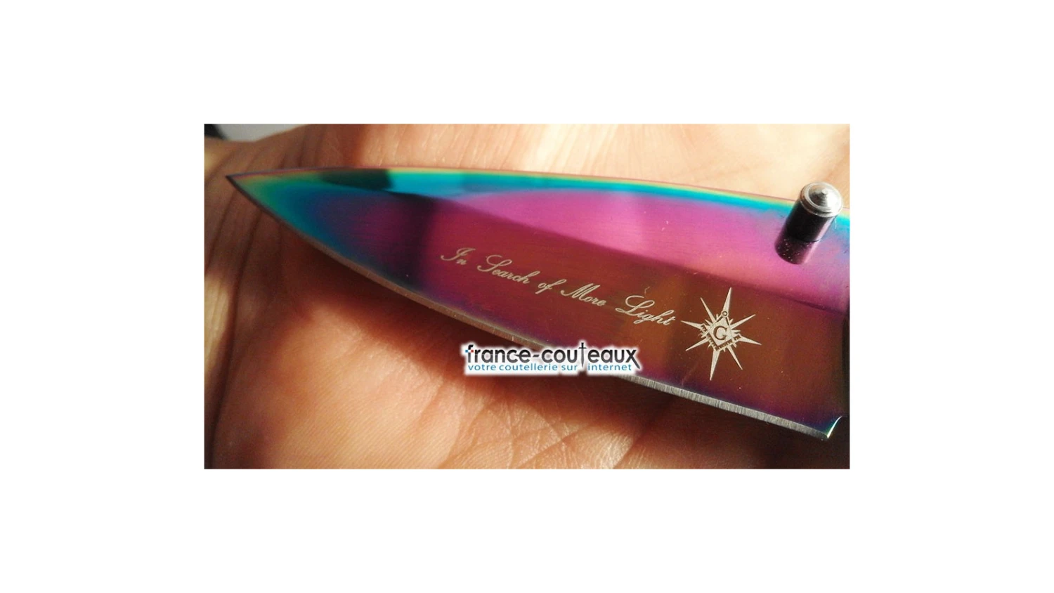 Sur cette lame Ă ouverture assistĂ©e, une touche raffinĂ©e orne l’Ă©mouture. C’est la gravure au laser du mĂ©daillon des Franc-Maçons: une rose des vents avec un G au centre surmontĂ© d’une Ă©querre et d’un compas ainsi que la phrase suivante: In search of more light.