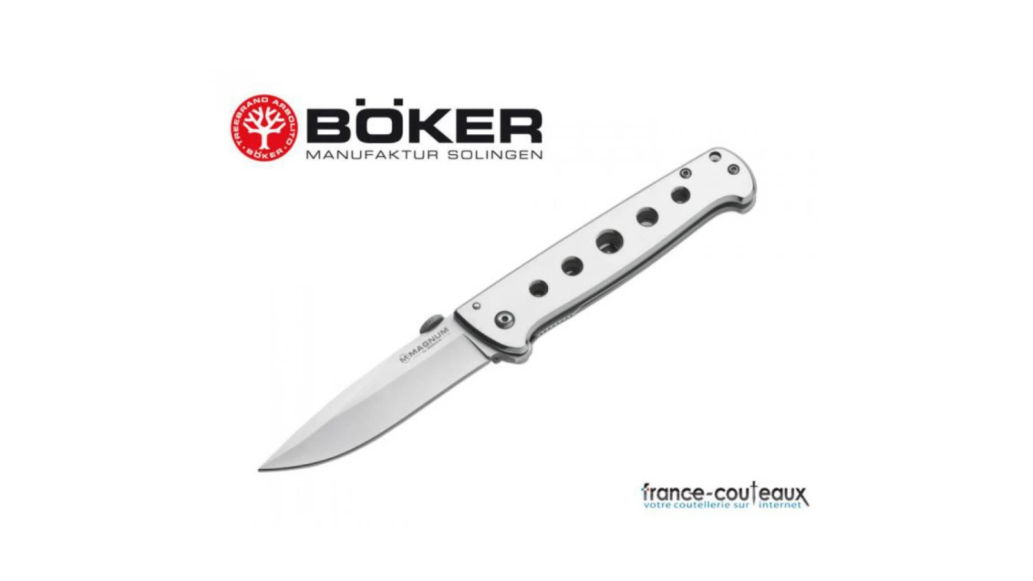 Le Boker Magnum Pocket Full métal est un couteau pliant en acier durable avec une finition polie. La poignée est également en acier inoxydable. Ce couteau est bien placé en matière de prix et a un coté sportif pour un usage quotidien. La lame est en satin 440 inoxydable. Le manche possède des perforations sphériques pour donner cet aspect sportif. Le système de fermeture est Liner Lock.