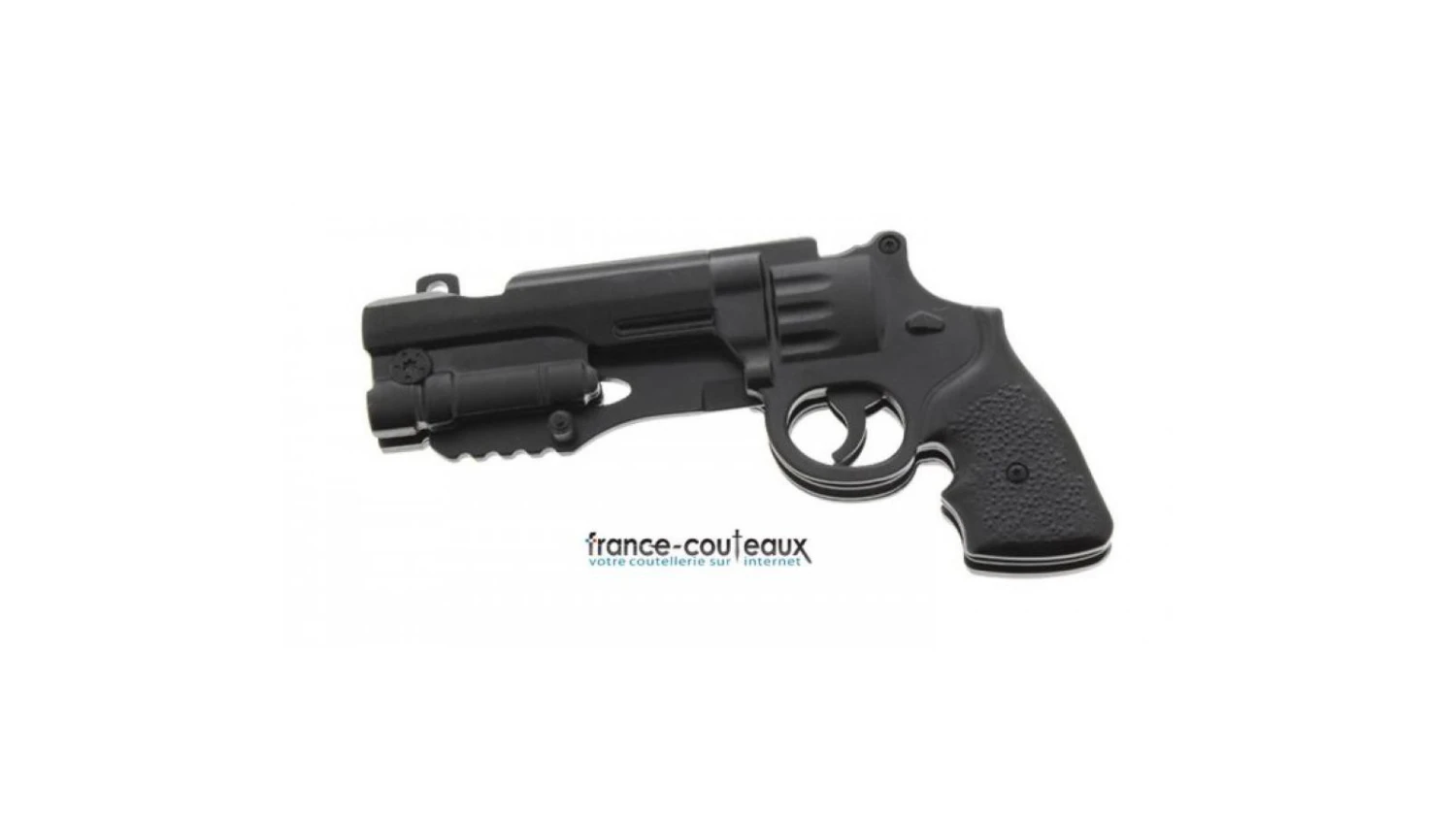 Petit couteau pliant en forme de revolver tout en noir, d’une longueur total de 23cm permettant de le transporter facilement et discrètement, entièrement démontable pour un entretien facilité