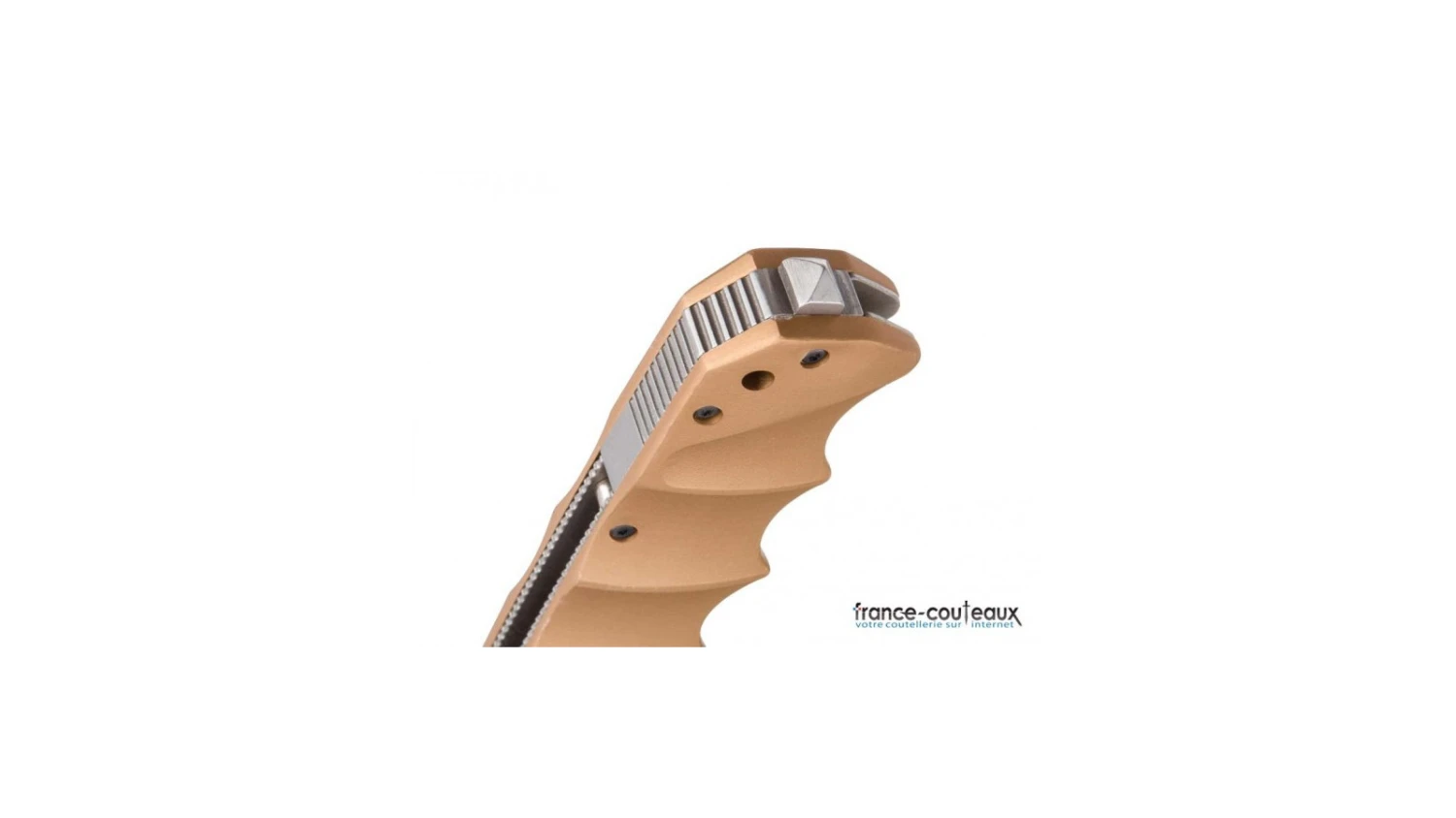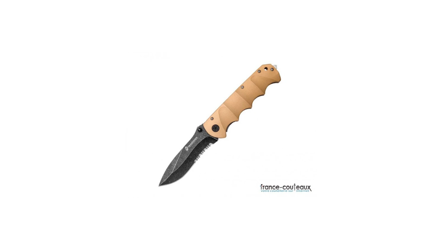 Ce couteau robuste possède un grand manche en aluminium avec une finition couleur dorée, moulé de la forme d’une main pour une bonne ergonomie. sur le pommeau de ce manche, il y a un brise vitre et sur l’arrière de celui ci se trouve un clip d’attache rapide à la ceinture.