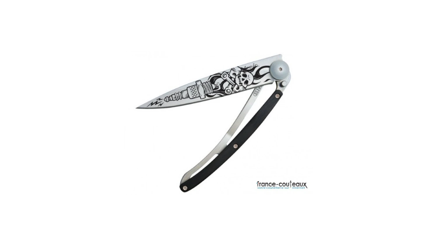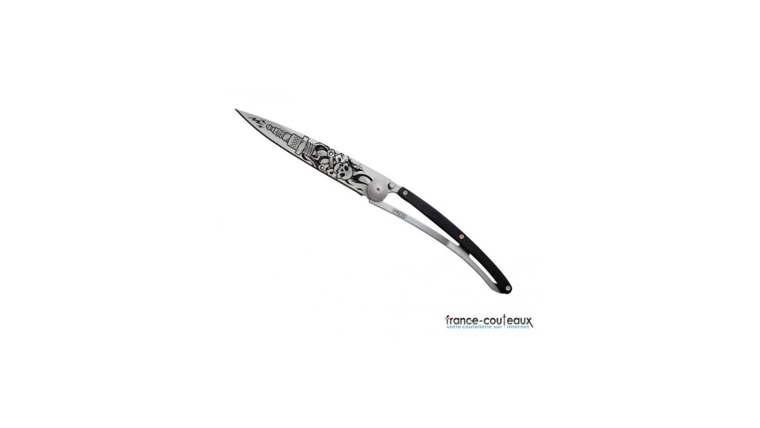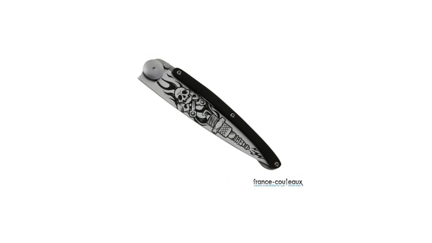 Cette édition du couteau Deejo Tattoo Biker est décoré d’une tête de mort et d’une bougie dans le style 100% biker américain. Les dessins Tattoo sont gravés au laser sur la lame en acier inoxydable de ce Deejo.