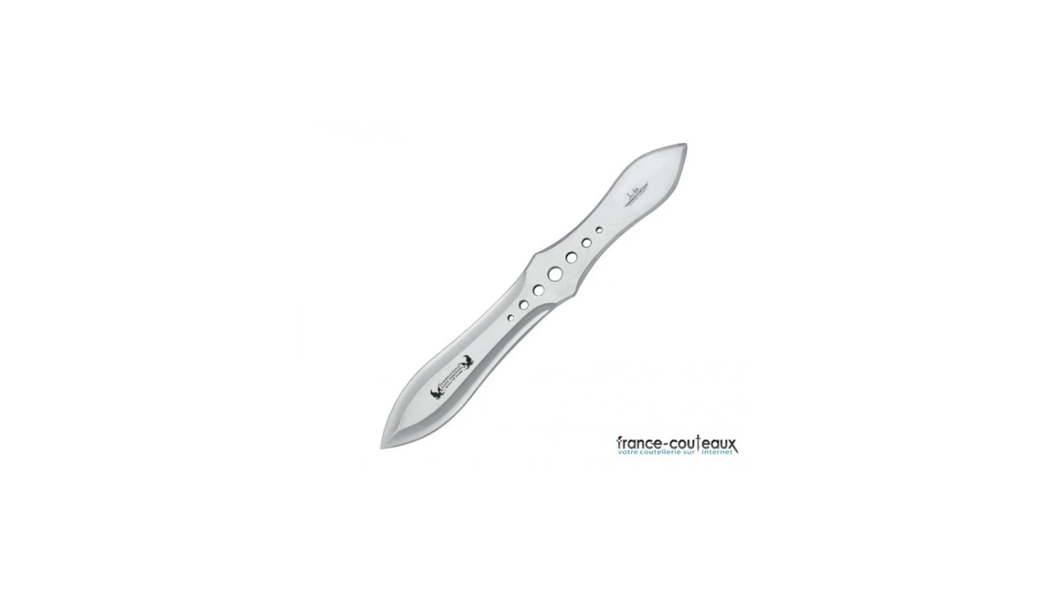 Sur ces , la n ainsi que le sigle de la fédération international de lancer de couteaux puisqu’il a été fabriqué pour la compétition. Des trous sont parsemés sur cette arme pour permettre un équilibrage parfait accentuant ainsi la précision lors du lancé.