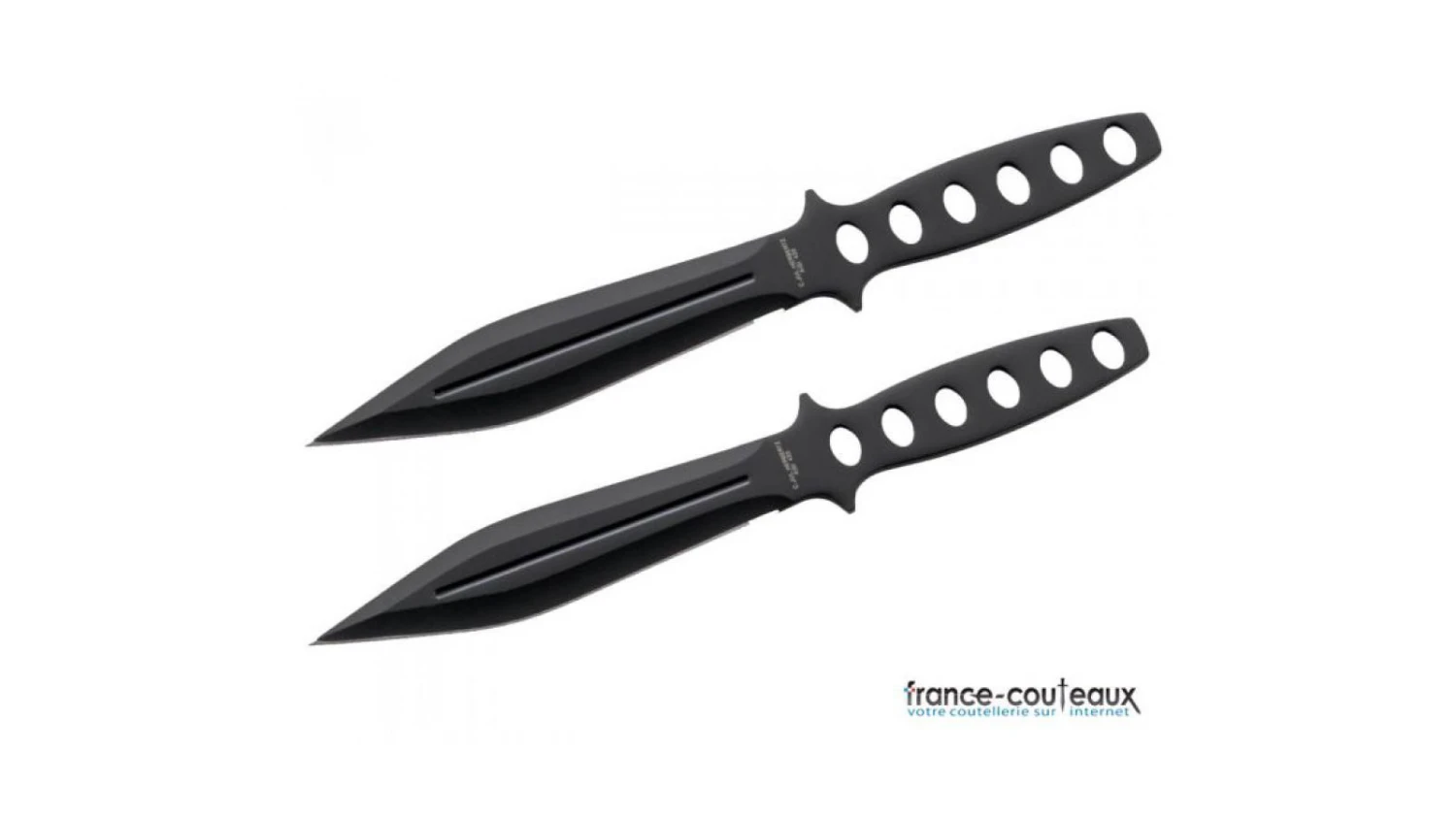 L’ensemble Herbertz comprend deux couteaux de lancer avec une lame de poignard. Les couteaux sont entiĂšrement rĂ©alisĂ©s en acier inoxydable 420. Le revĂȘtement noir empĂȘche les reflets. Ce kit comprend une gaine en nylon avec un passant cousu qui permet facilement le port Ă la ceinture.