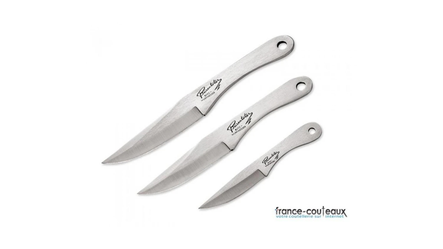 Notre avis : C’est un ensemble de couteaux en acier monobloc simple robuste. Ces couteaux sont équilibrés au centre, ce qui permet de les lancer aussi bien par la lame que par le manche. Poids de 90 grammes par couteau qui est un bon rapport pour un lancer puissant. L’assortiment permettra de définir la taille et le poids qui vous convienne le mieux pour votre prochain achat de couteaux à lancer.