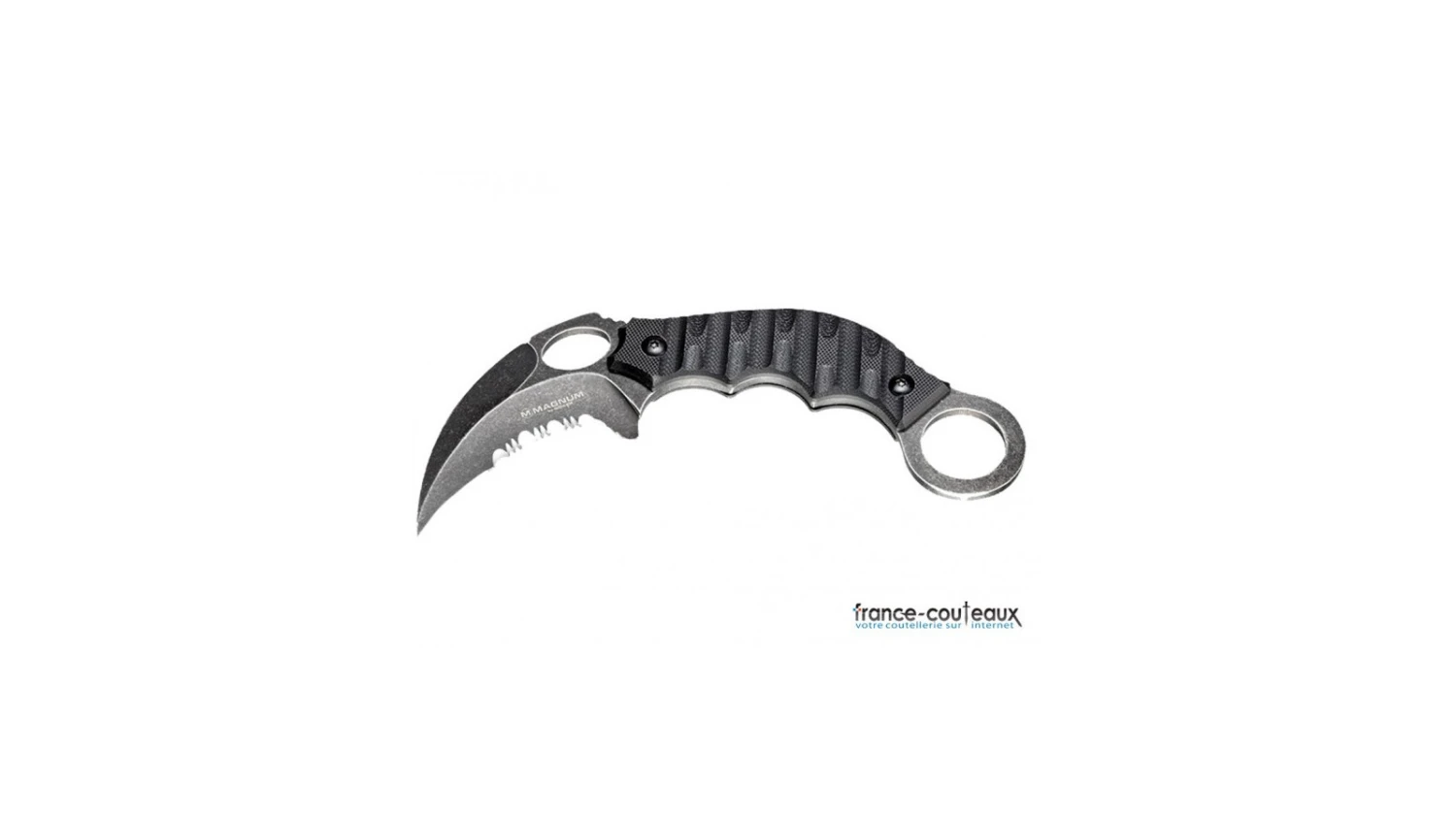 Karambit Magnum par Böker, hôtel Romeo qui est équipé d’une lame mixte en acier inoxydable 440 A avec une finition stone washed qui permet une plus grande durabilité. Un trou est également disponible sur cette lame permettant de l’équilibrer et de lui donner un aspect plus agressif.