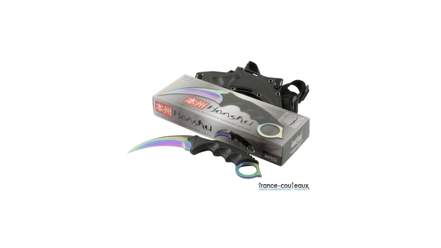 Couteau Karambit Honshu lame rainbow arc en ciel, ce couteau tactique des arts martiaux orientaux et directement inspiré des techniques de combat ancestrales. Ce couteau courbe en forme de griffe et particulièrement apprécié lors du combat rapproché avec votre adversaire. Ici dans une version rainbow, sa lame en acier inoxydable 7CR13 s’habille au couleurs d’un arc en ciel, passant par des reflets du bleu au violet.