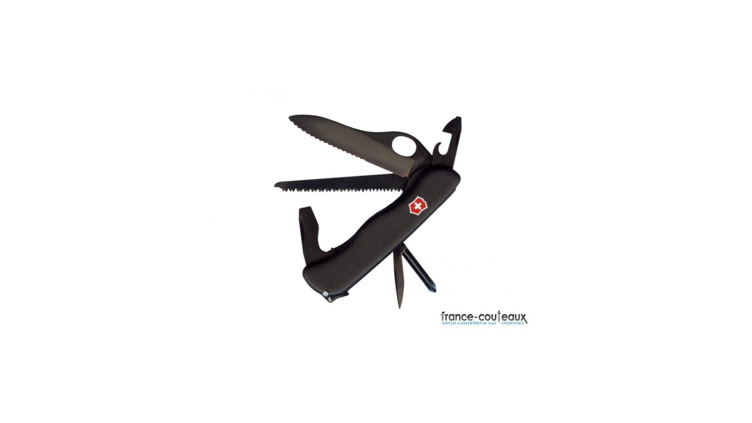 La fonction principale de ce couteau de poche est sa grande lame blocable mixte de 8 cm. Il dispose également d’une scie à bois, de trois tournevis, d’un dénudeur de fils électriques, d’un décapsuleur, d’un ouvre-boite, d’un poinçoin alésoir, d’un cure dent, d’une pince à épiler et d’un anneau.